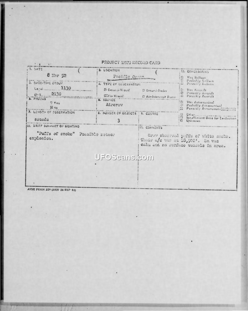 At 2130Z on 8 March 1952, a crew observed three puffs of white smoke at an unreported altitude at position 33°36'North, 156°23'West.