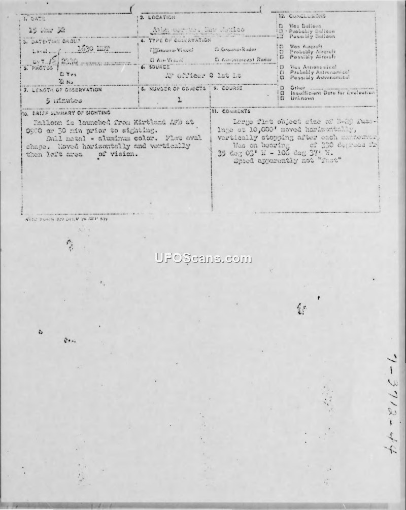 A sighting report from March 15, 1952, describing an all-metal, oval-shaped object observed near Kirtland AFB. The object performed horizontal and vertical maneuvers at 10,000 feet for five minutes.