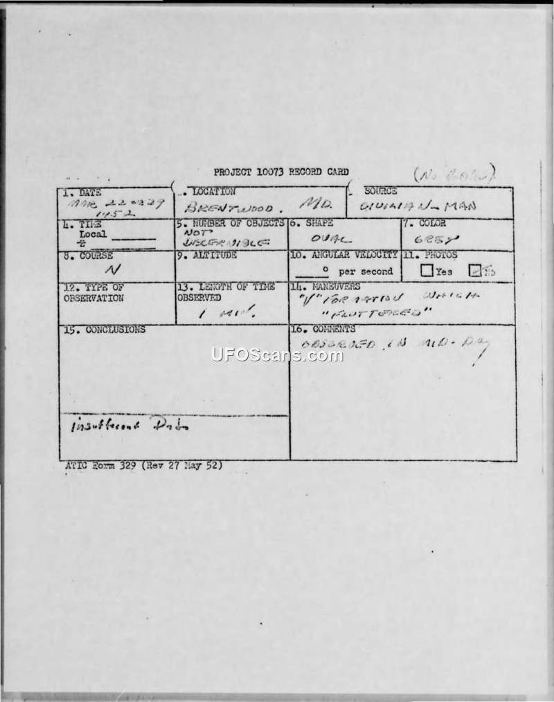 A civilian in Brentwood, Maryland, reported a V-formation of grey, oval objects in March 1952. The Air Force recorded the incident under Project 10073 but concluded there was insufficient data for further investigation.