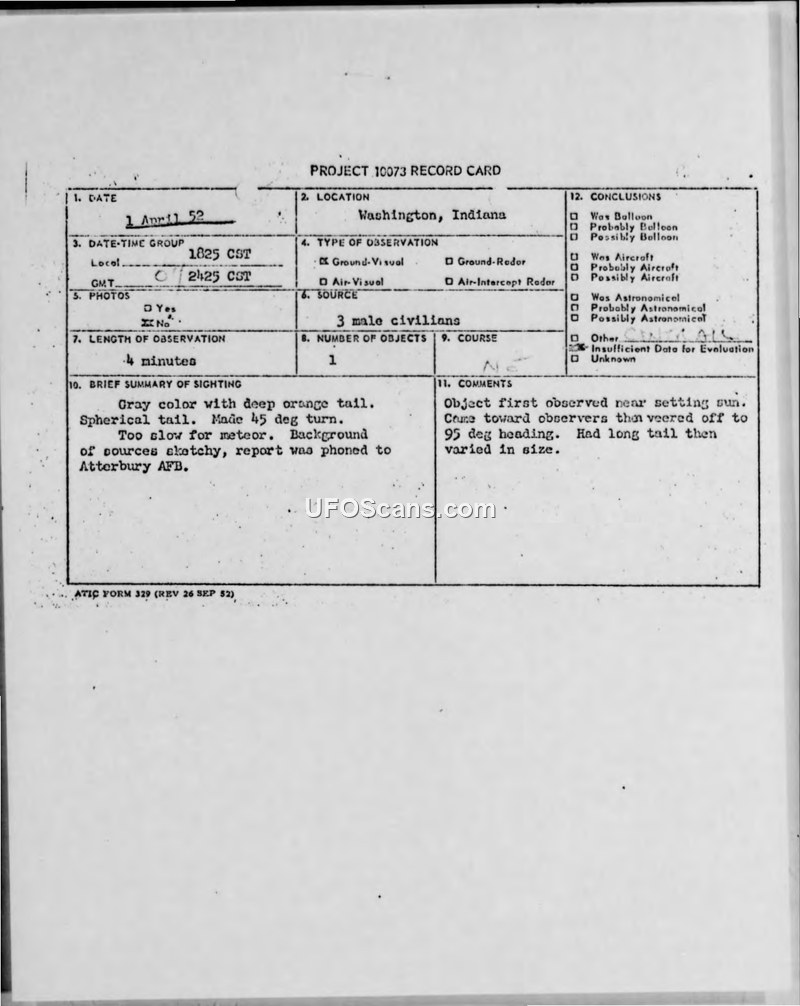 Three civilians reported a high-speed, orange-tailed object near Washington, Indiana, on 1 April 1952. The Air Force investigated the report and concluded it was likely an aircraft vapor trail illuminated by the setting sun.
