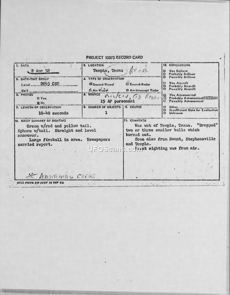 A Project 10073 record card detailing a green fireball sighting over Temple, Texas, on April 2, 1952. The object was observed by 15th Air Force personnel and reported from multiple locations.