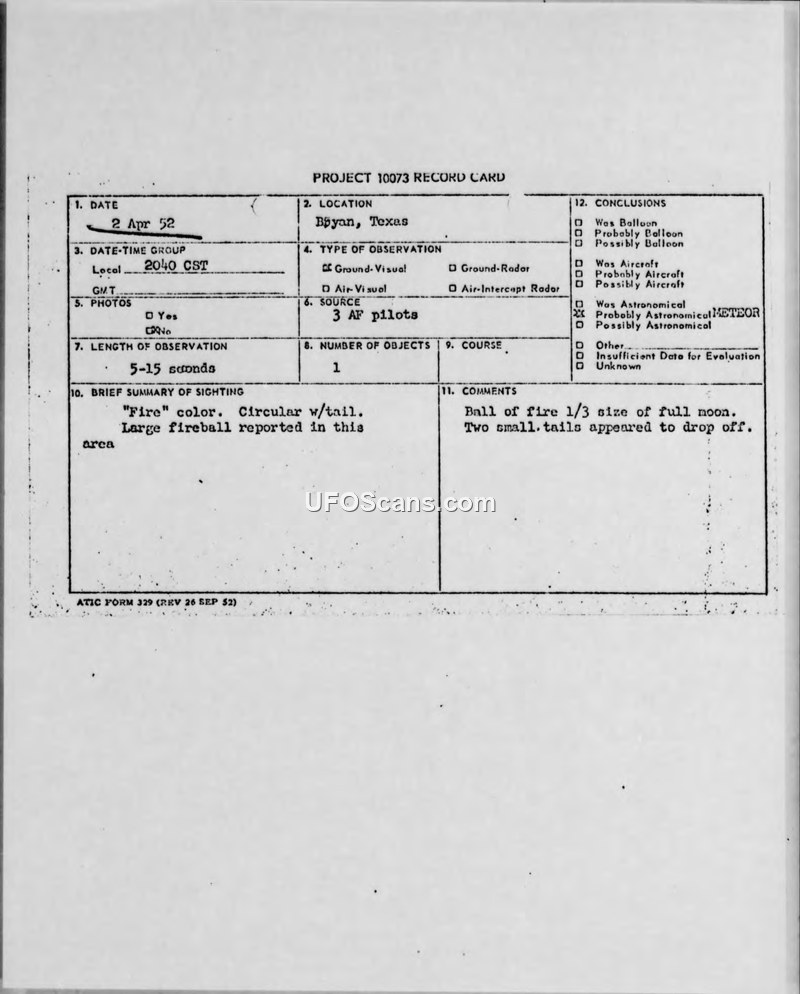 A sighting of a fireball by three Air Force pilots in Bryan, Texas, on April 2, 1952, was officially classified as a meteor.