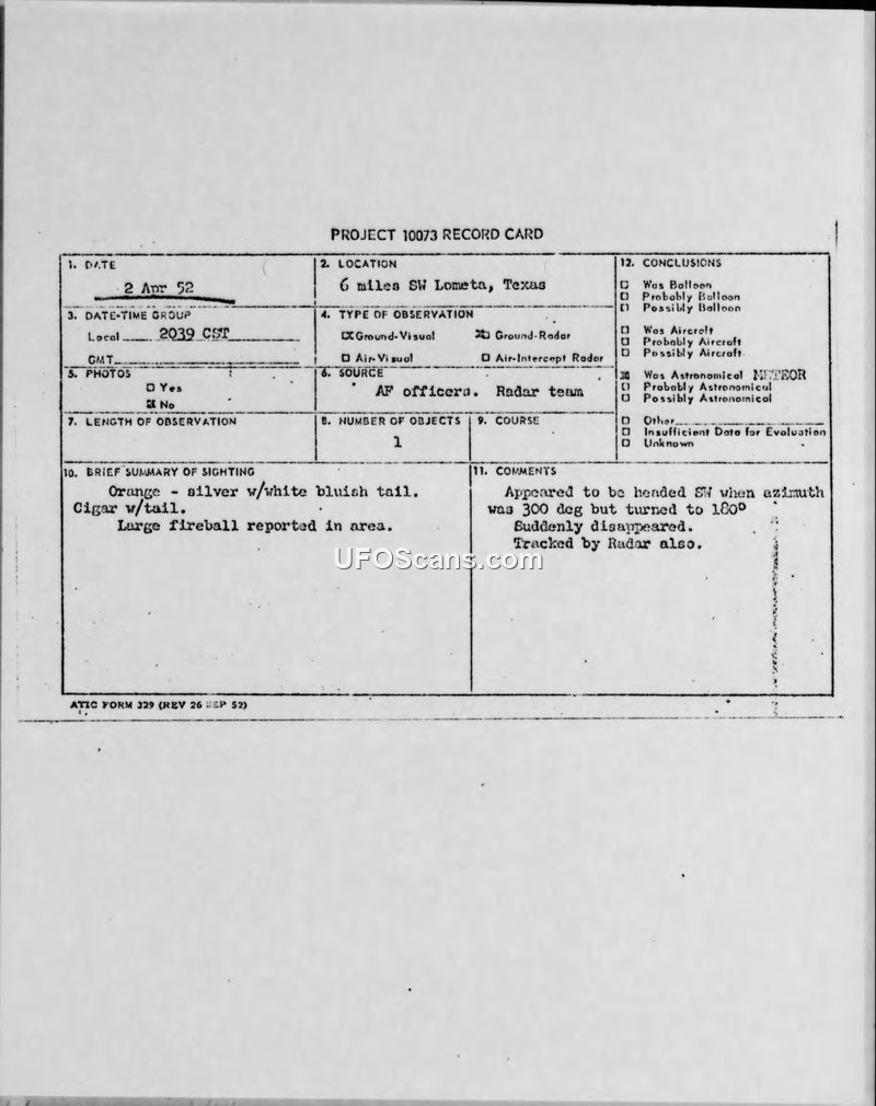 Project 10073 Record Card — 2 Apr 52, 6 miles SW Lometa, Texas