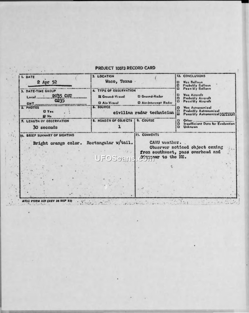 Project 10073 Record Cards and Air Intelligence Information Reports — Waco, Texas, April 1952