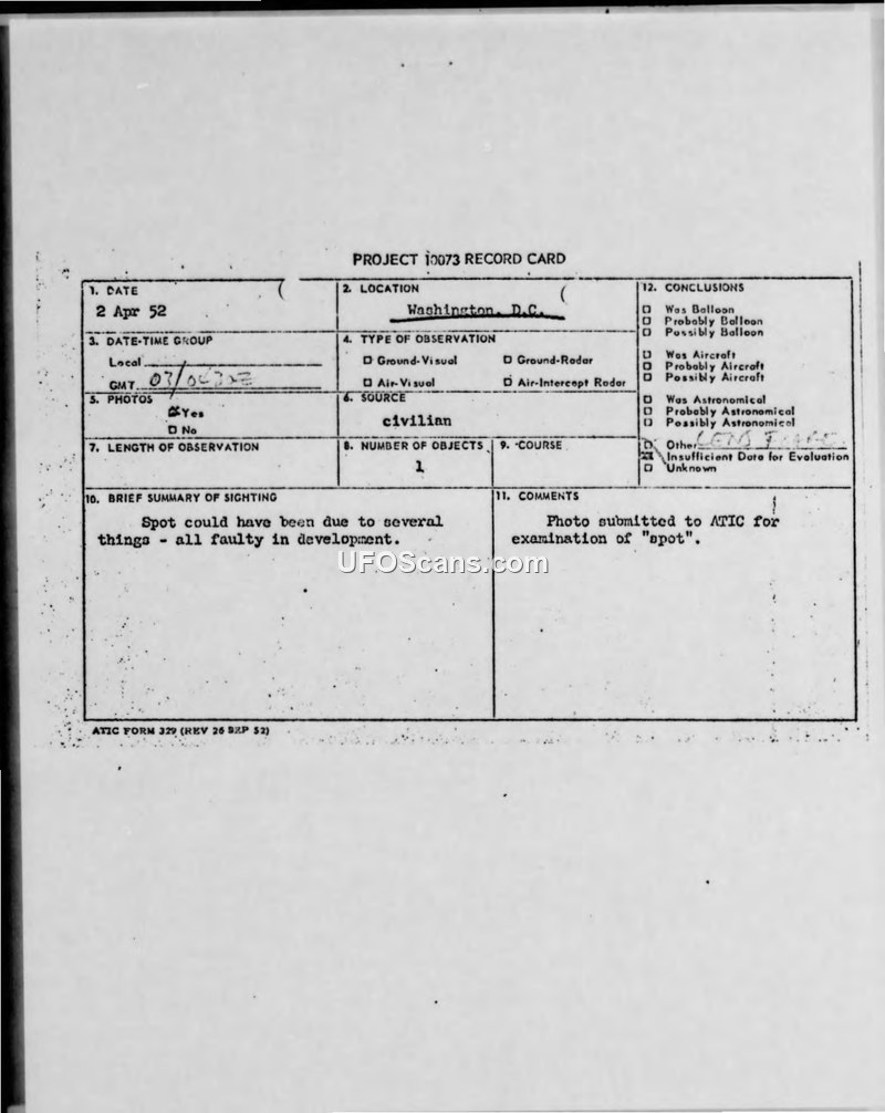 Project 10073 Record Card: Washington D.C. Sighting, 2 April 1952