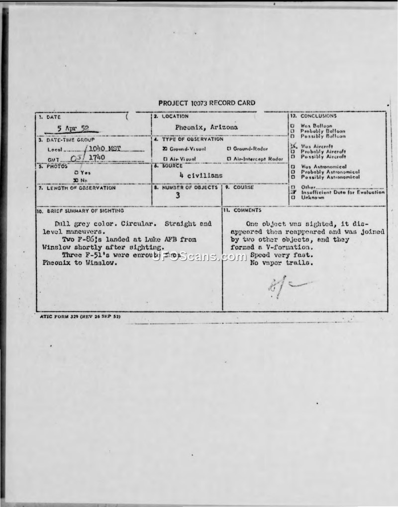 Project 10073 Record Card and Air Intelligence Information Report — Phoenix, Arizona, 5 April 1952