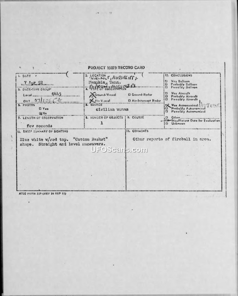A Project 10073 record card documenting a sighting of a 'Cobton Basket' shaped object in Mississippi on April 7, 1952. The object was officially classified as a meteor.