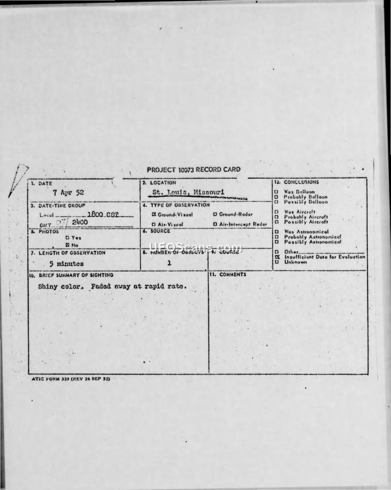 Project 10073 Record Card — St. Louis, Missouri, 7 April 1952