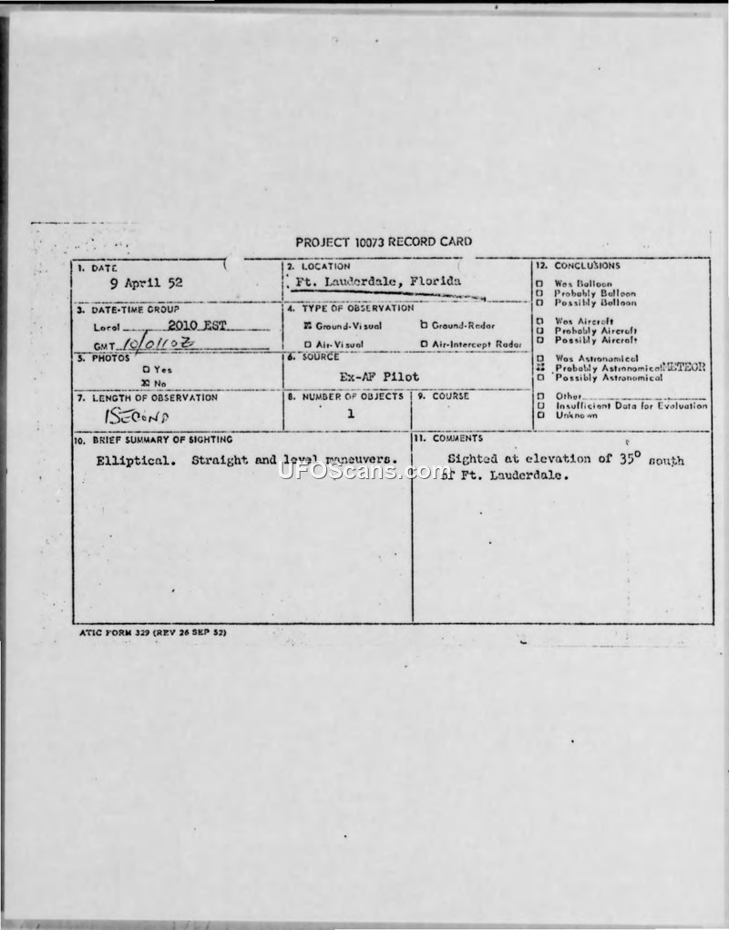 A former Air Force pilot reported a high-speed, cigar-shaped object over Fort Lauderdale on 9 April 1952. The military investigation, while noting the witness's credibility, officially categorized the event as similar to a meteor or fireball.