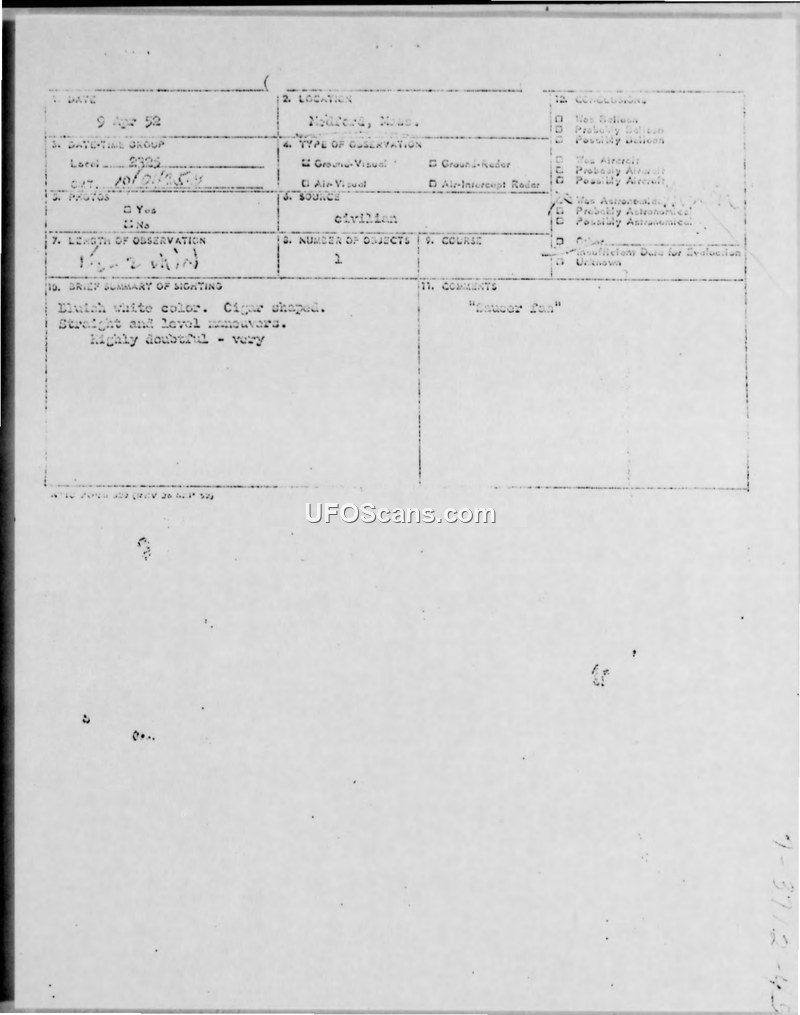 A civilian reported a cigar-shaped, bluish-white object in Medford, Massachusetts, on 9 April 1952. The report is marked as highly doubtful by the evaluator.