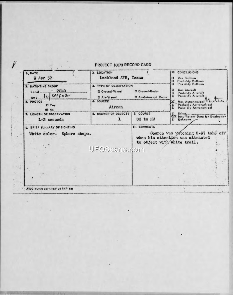 An airman at Lackland AFB reported a white, spherical object with a white trail on 9 April 1952. The Intelligence Division determined there was insufficient data to evaluate the sighting.
