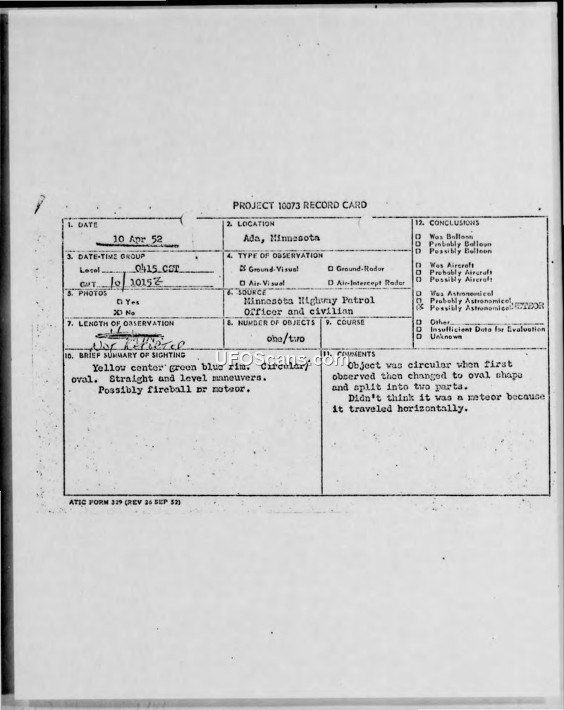 Project 10073 Record Card — 10 Apr 52, Ada, Minnesota