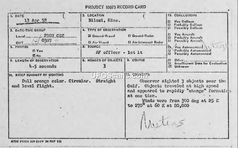 Project 10073 Record Card and Air Intelligence Information Reports — Biloxi, Mississippi, April 1952