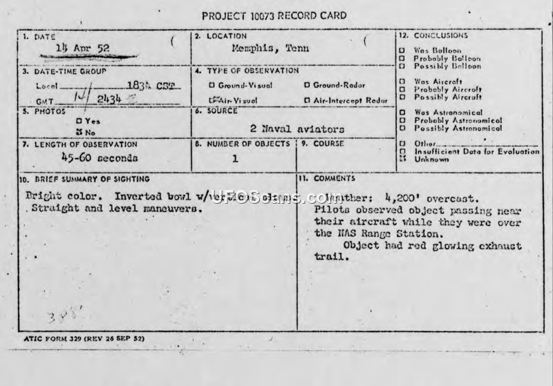 Project 10073 Record Card and Air Intelligence Information Report — Memphis, Tennessee, 14 April 1952