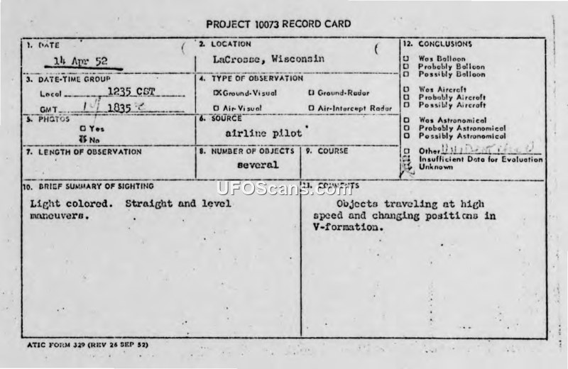 A 1952 sighting of objects in V-formation by an airline pilot in LaCrosse, Wisconsin, was never properly investigated. Later correspondence from 1968 criticizes the Air Force for failing to follow up on this credible report.