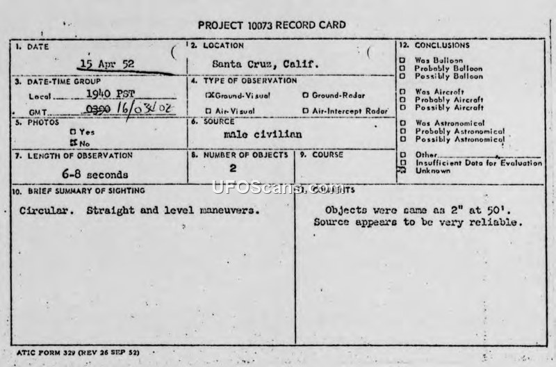 Project 10073 Record Card — Santa Cruz, California, 15 April 1952