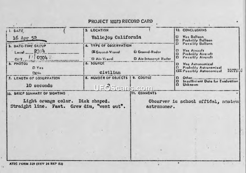 This document contains a Project 10073 record card and associated field reports regarding unidentified aerial phenomena observed in April 1952. The primary report details a sighting on 16 April 1952 in Vallejo, California, by a witness identified as a school official and amateur astronomer. The witness reported observing two disk-shaped, light-orange objects moving in a straight line at high speed for approximately 10 seconds. The objects appeared near the star Regulus and disappeared near the stars Castor and Pollux. The witness noted that the objects remained parallel throughout the observation and eventually grew dim before disappearing. The official conclusion for this incident was categorized as 'Possibly Astronomical' (METEOR). The document also includes a separate report from 17 April 1952, involving a phone report from an inactive USAFR officer regarding 8 to 12 glowing objects in a 'V' formation traveling east to west over Bethesda at 2140 hours. This secondary sighting was investigated by the Air Force, which determined that a B-45 aircraft from Langley was flying in that area at 38,000 feet at the time, which was considered a very probable explanation for the Bethesda sighting. The document concludes with a note that jet interceptor squadrons were contacted regarding the 17 April event, with no jet activity reported.