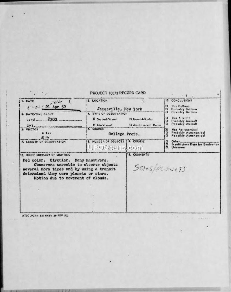 A series of UFO sightings in Jamesville, New York, in April 1952 were investigated by the Air Force and determined to be astronomical bodies (planets/stars) viewed through high-altitude clouds. The witnesses themselves reached this conclusion after using a transit to track the objects.