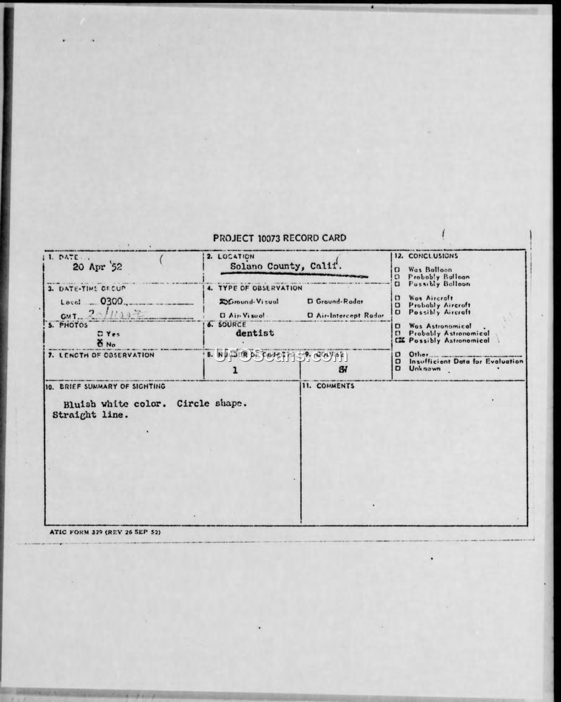A dentist reported a circular, bluish-white luminous object in the sky over Solano County, California, on 20 April 1952. The Air Force investigation concluded the object was not a meteor and closed the case with no further action.