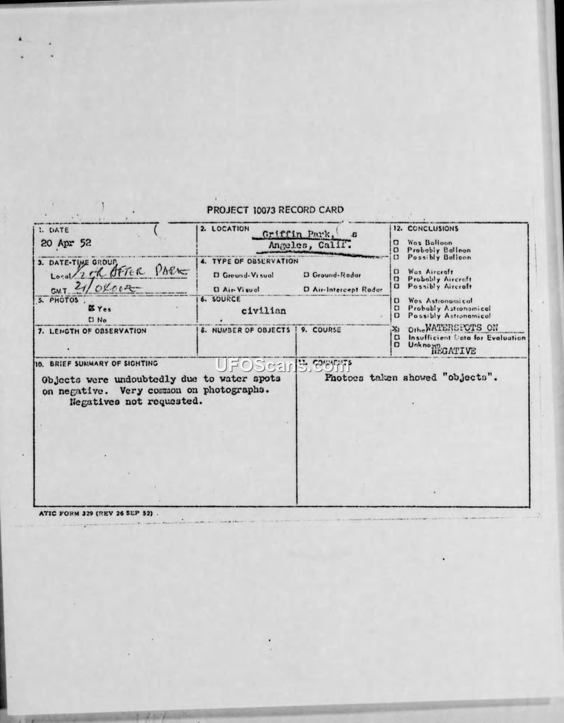 Project 10073 Record Card — Griffith Park, Los Angeles, California, 20 April 1952