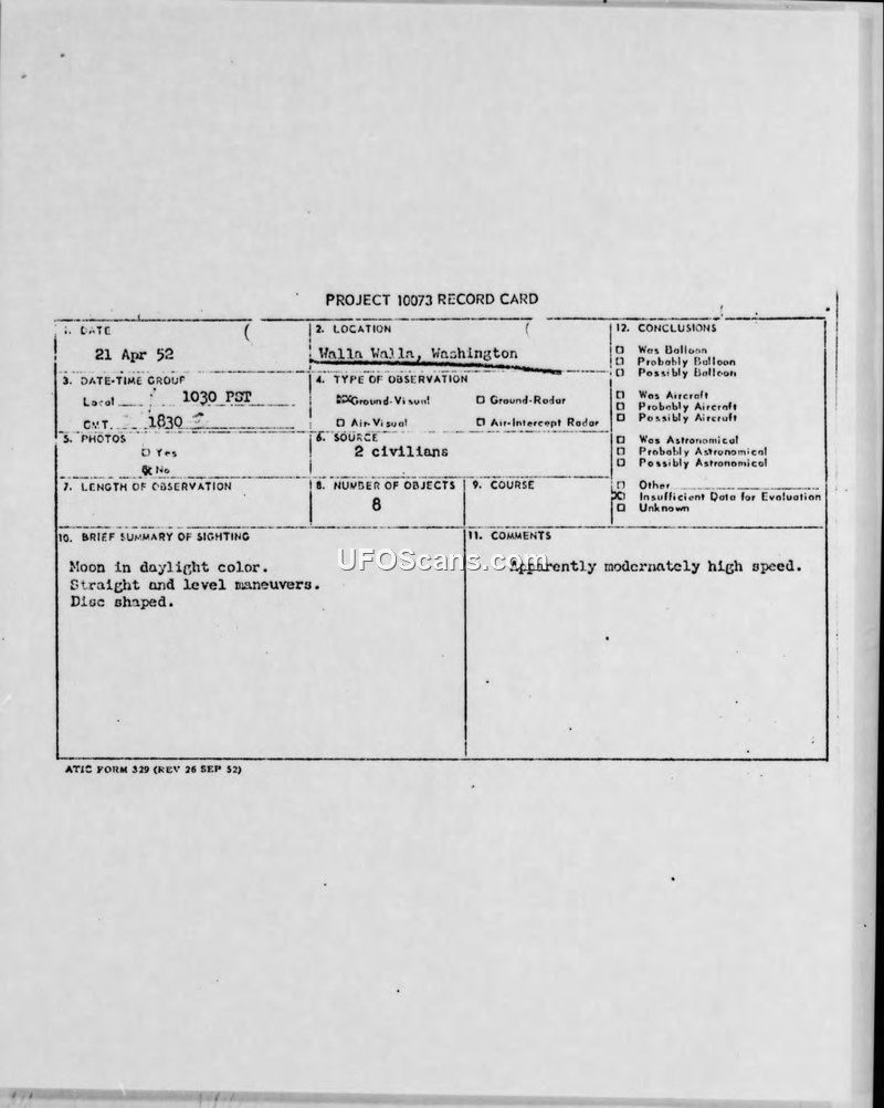 On April 21, 1952, two civilians observed eight disc-shaped objects flying eastward over Walla Walla, Washington. The objects were estimated to be traveling at 500 mph with no sound or exhaust trails.