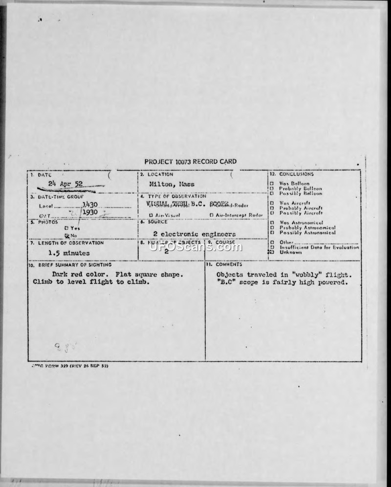 Two USAF civilian electronics technicians observed two unidentified, flat, square-like objects exhibiting wobbly flight over Milton, Massachusetts, on 24 April 1952. The report concludes that no identification was made and no physical evidence was recovered.