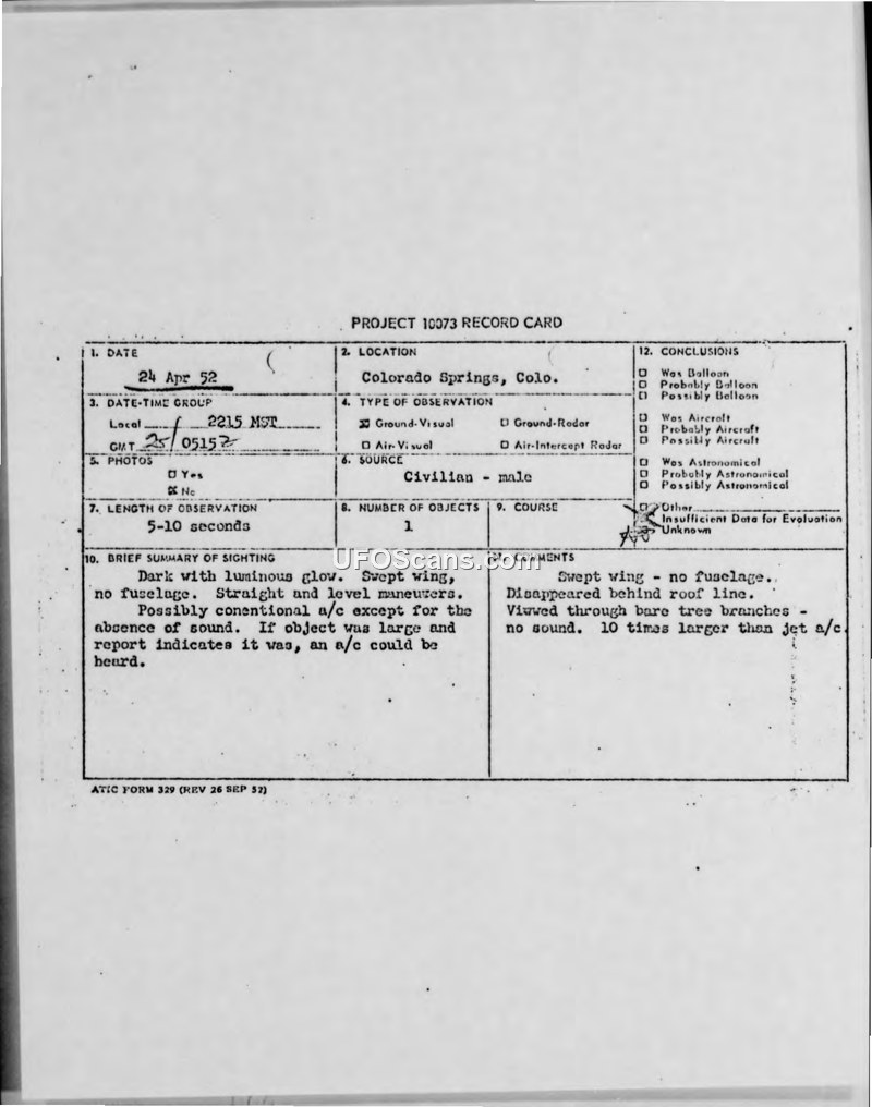 Project 10073 Record Card — Colorado Springs, Colorado, 24 April 1952