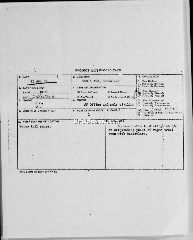 Project 10073 Record Card and Air Intelligence Information Report — Thule Air Base, Greenland, April 1952