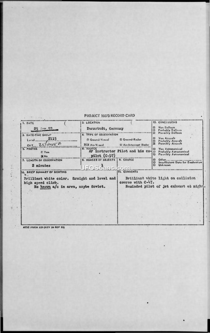 Project 10073 Record Card - Darmstadt, Germany - 25 April 1952