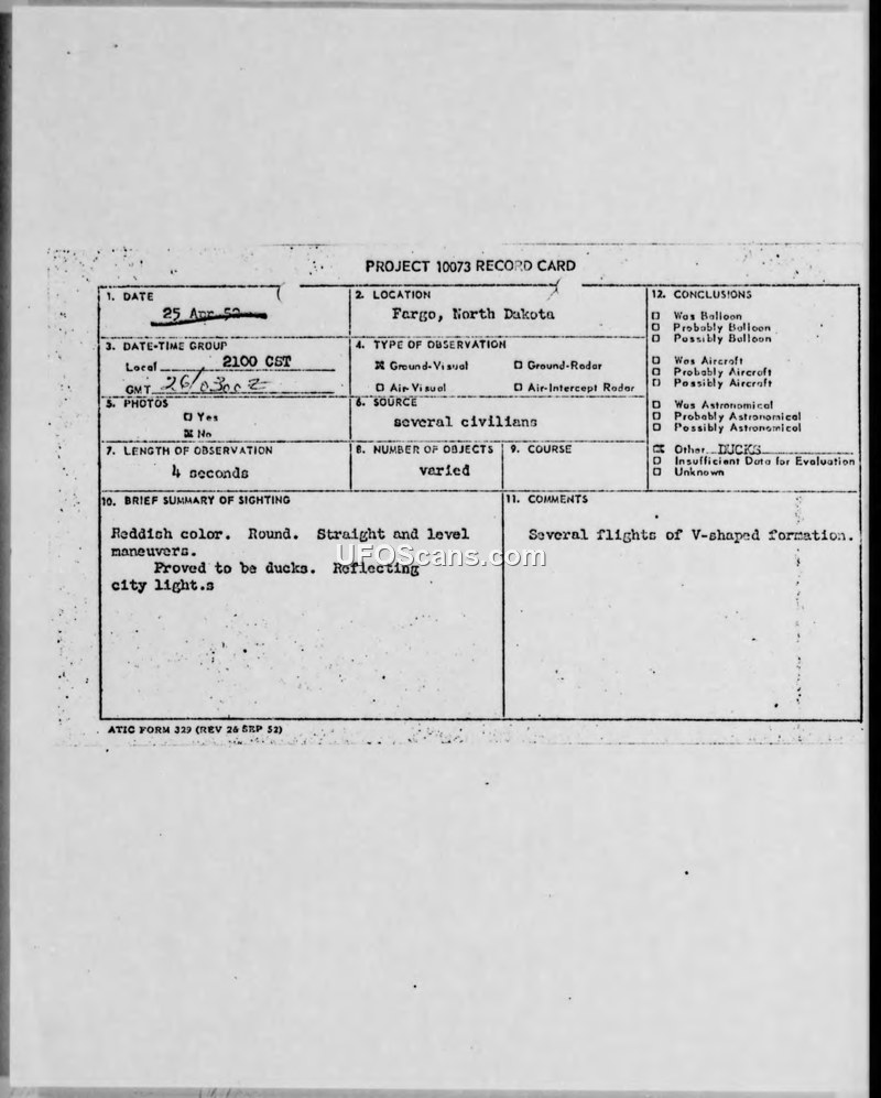 A series of reports from April 1952 details a sighting of glowing, V-shaped formations over Fargo, North Dakota. The investigation concluded that the objects were migrating mallard and teal ducks reflecting city lights.