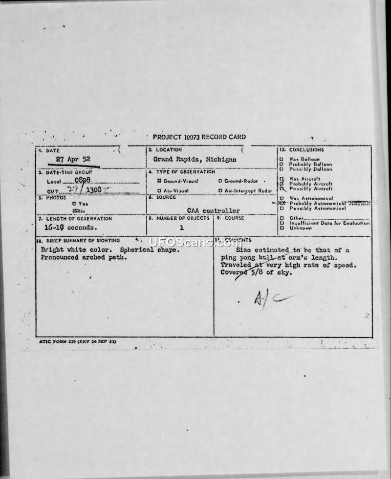 A civilian witness reported a high-speed, spherical, bright white object over Grand Rapids, Michigan, on 27 April 1952. Official investigation found no radar confirmation and suggested the sighting may have been an aircraft distorted by the sun.