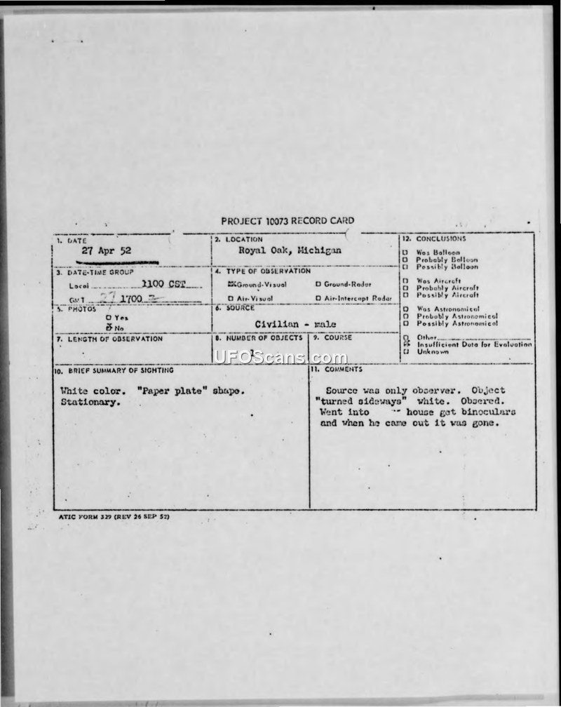 A civilian in Royal Oak, Michigan, reported a stationary, white, paper-plate-shaped object on April 27, 1952. The military investigation concluded there was insufficient data to evaluate the sighting.