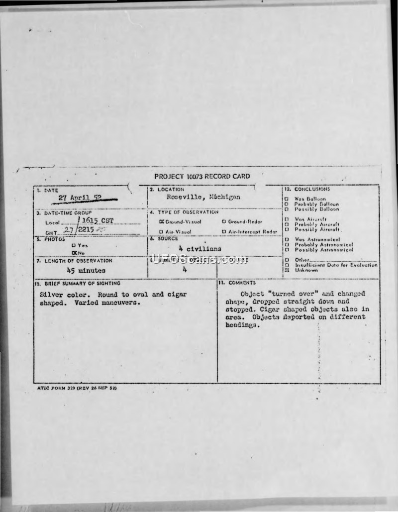 On April 27, 1952, at approximately 1615 hours, four individuals in Roseville, Michigan, observed four unconventional aircraft in the sky. The witnesses, who possessed prior military experience, were in a backyard pitching horseshoes when they first spotted a silver, round object that appeared motionless. Using high-power binoculars, they observed the object turn and change shape into an oval or egg-like form. It featured a dark underside, though it was unclear if this was a door or a painted side. The object subsequently dropped straight down and stopped. Two additional silver, cigar-shaped objects, larger than the first, appeared in the same area. The witnesses reported that these objects appeared to originate from the initial ball-shaped object or simply materialized in the same vicinity. The objects remained visible until approximately 1700 hours, at which point the ball-shaped object ascended rapidly and disappeared, while the cigar-shaped objects departed in easterly and westerly directions. During this same period, a fourth object—a silver, cigar-shaped craft—was observed traveling at a tremendous speed from the northeast to the northwest at a great altitude. The observers tracked this object with binoculars, noting that it traveled horizontally without making any sound or leaving an exhaust trail. The sky was clear and cloudless throughout the 45-minute observation. The witnesses asserted that the objects were not weather balloons or conventional aircraft, citing their movement and altitude. Captain Anthony W. Rosinia of the 4708th Defense Wing documented the report, noting that he could not verify the reliability of the source or the credibility of the information provided. The incident was subsequently recorded on a Project 10073 record card, which categorized the conclusion as unknown, noting that the objects were too fast for balloons and that no aircraft were in the area.