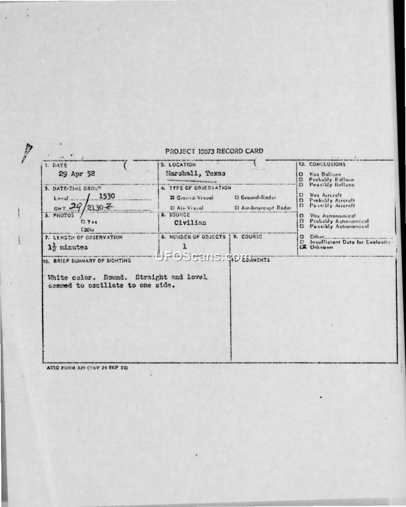 A private pilot reported a round, white, fast-moving object over Marshall, Texas, on April 29, 1952. The sighting lasted 1.5 minutes and was officially classified as 'Unknown' by the Air Technical Intelligence Center.