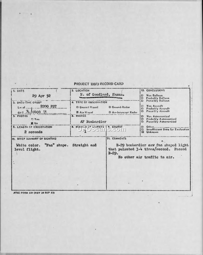 A B-29 bombardier reported a fan-shaped, pulsating light over Kansas in April 1952. Despite investigation by the Department of Astronomy at Washburn University, the phenomenon remained unexplained.