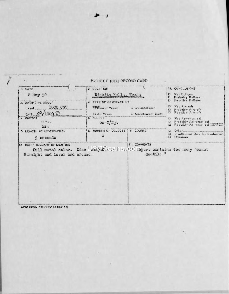 Project 10073 Record Card — Sighting at Wichita Falls, Texas, 2 May 1952