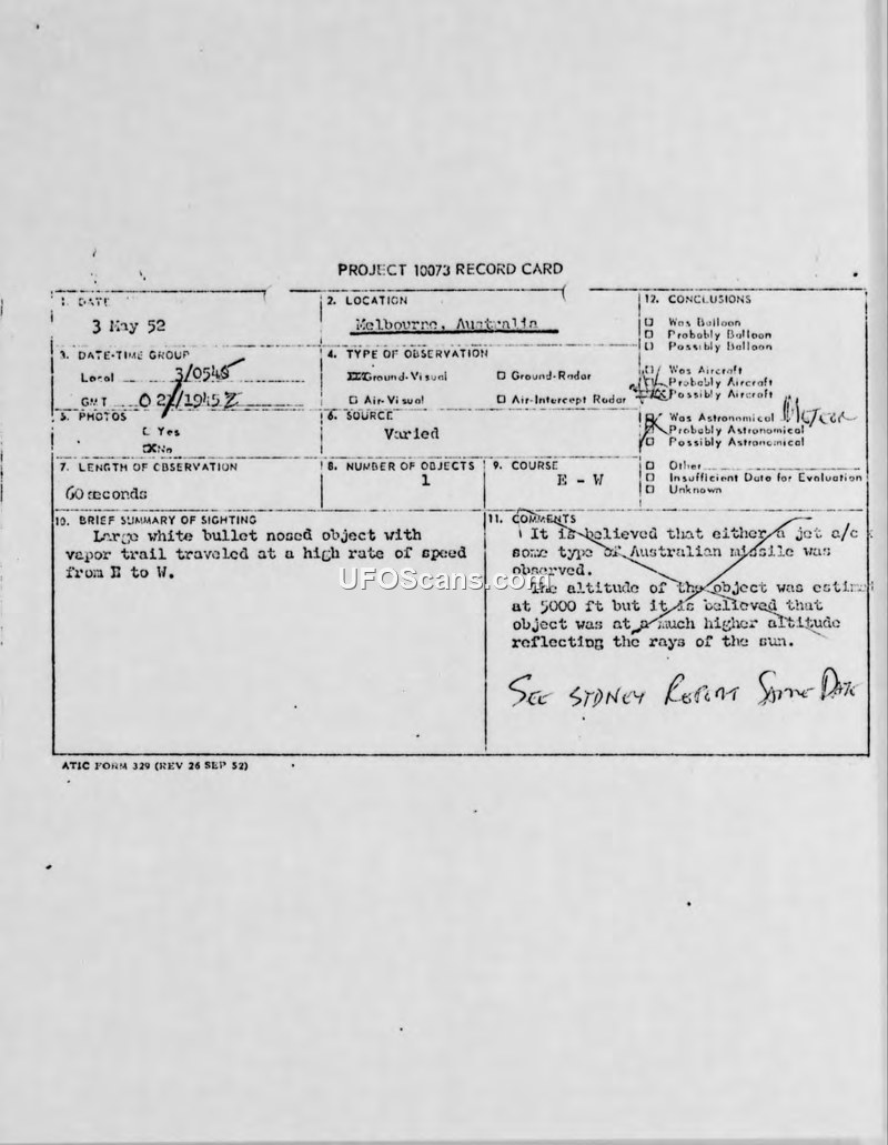 A series of reports from May 1952 regarding aerial phenomena observed in Australia. RAAF investigators concluded the sightings were likely caused by a meteor.