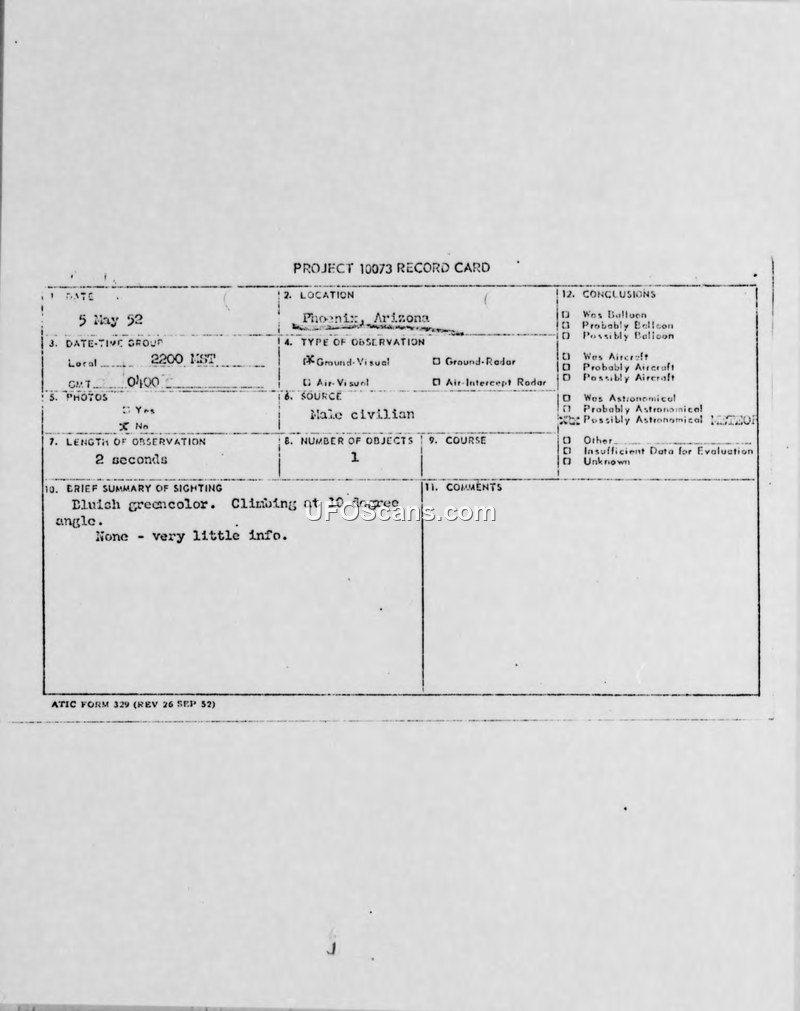 A civilian in Phoenix, Arizona, reported a two-second sighting of a fast-moving, bluish-green light on May 5, 1952. Air Force intelligence reports concluded the object's characteristics could not be determined, though it was noted to resemble a meteor or fireball.