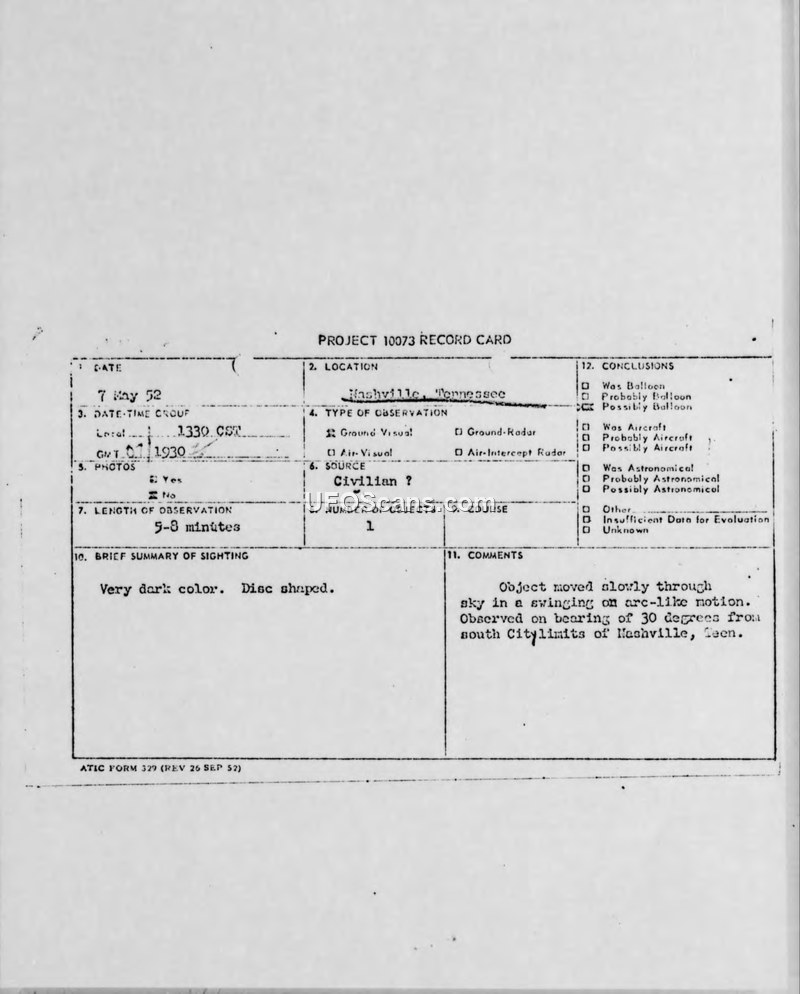 A civilian in Nashville, Tennessee, reported a slow-moving, dark, disc-shaped object with a pendulum-like flight path on May 7, 1952. The incident was documented by the Air Technical Intelligence Center under Project 10073.