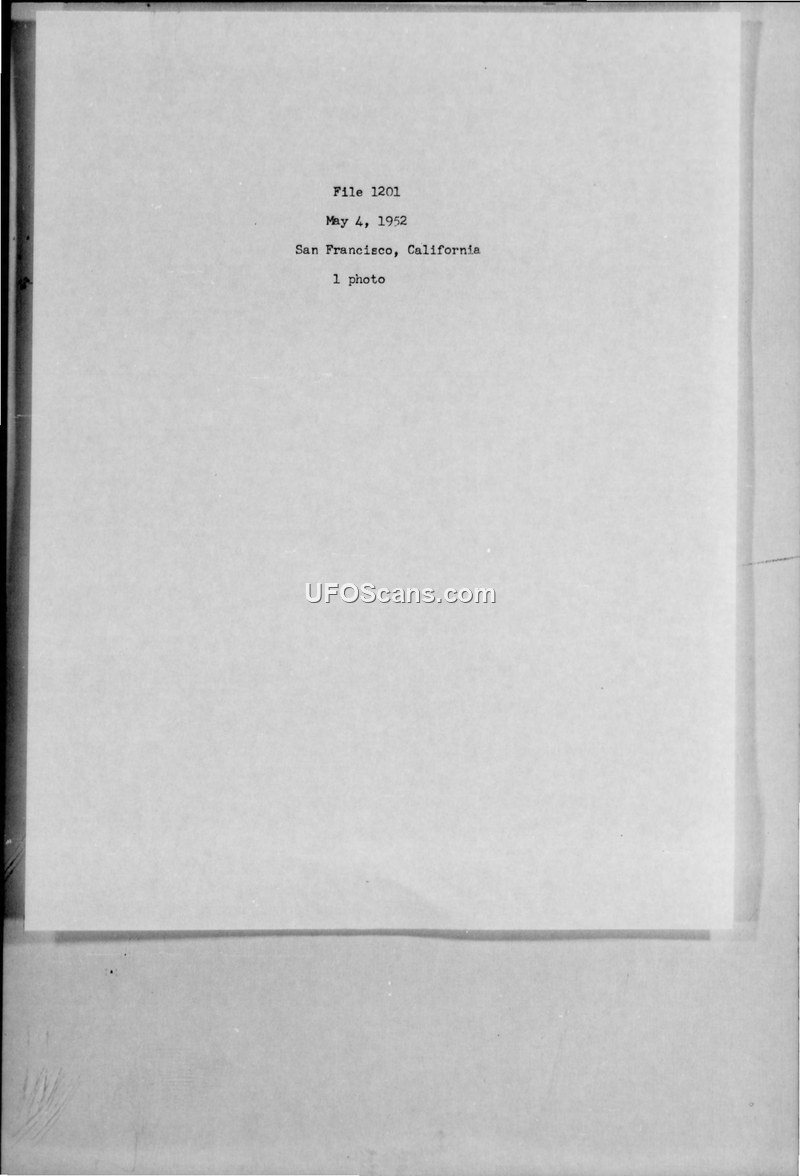 This document, identified as File 1201, serves as a record of a sighting incident that occurred on May 4, 1952, in San Francisco, California. The primary content of the file is a single photograph documenting an unidentified object. The document explicitly identifies Paul Eisenberg as the individual who photographed the object on the date in question. Beyond the date, location, and the existence of the photographic evidence, the document provides no further narrative details, descriptions of the object's characteristics, or official analysis regarding the nature of the sighting.