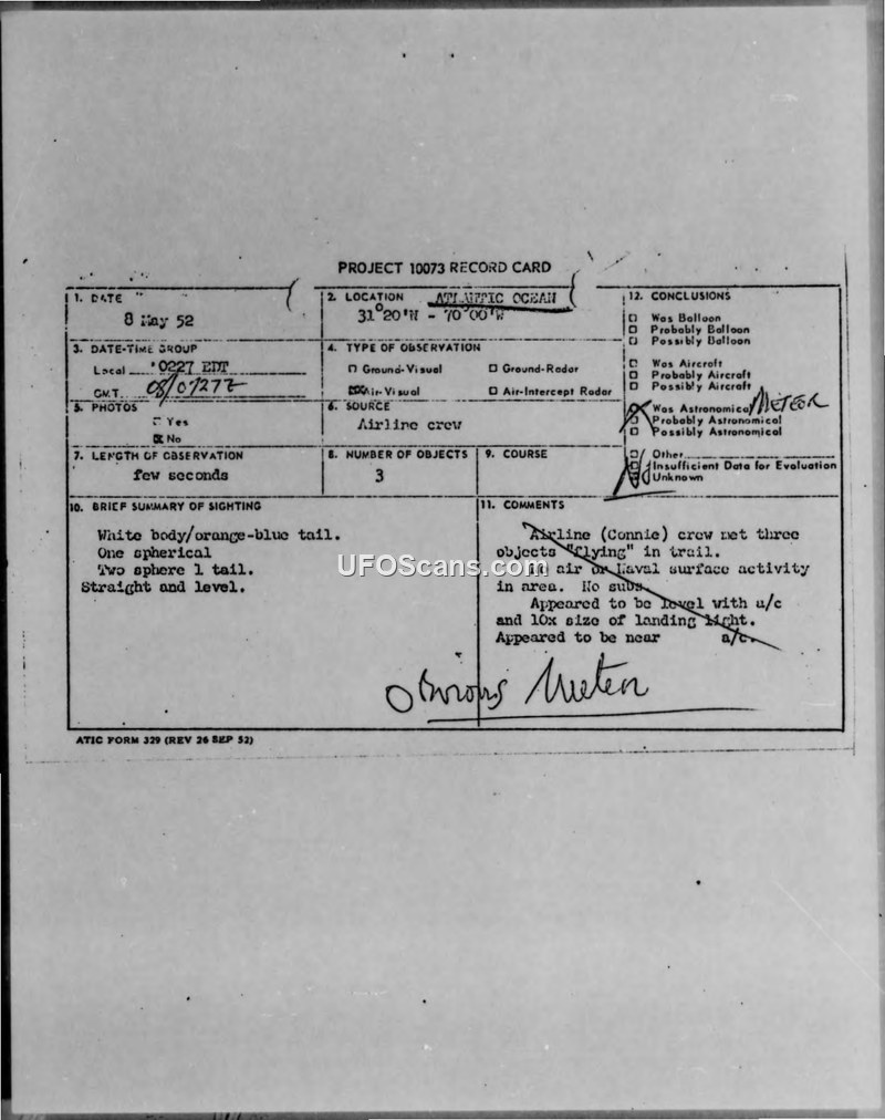 On May 8, 1952, a Pan American flight crew observed three unidentified circular objects with tails over the Atlantic Ocean. Military investigations confirmed no missile, naval, or air activity in the area, and the incident remained officially unexplained.