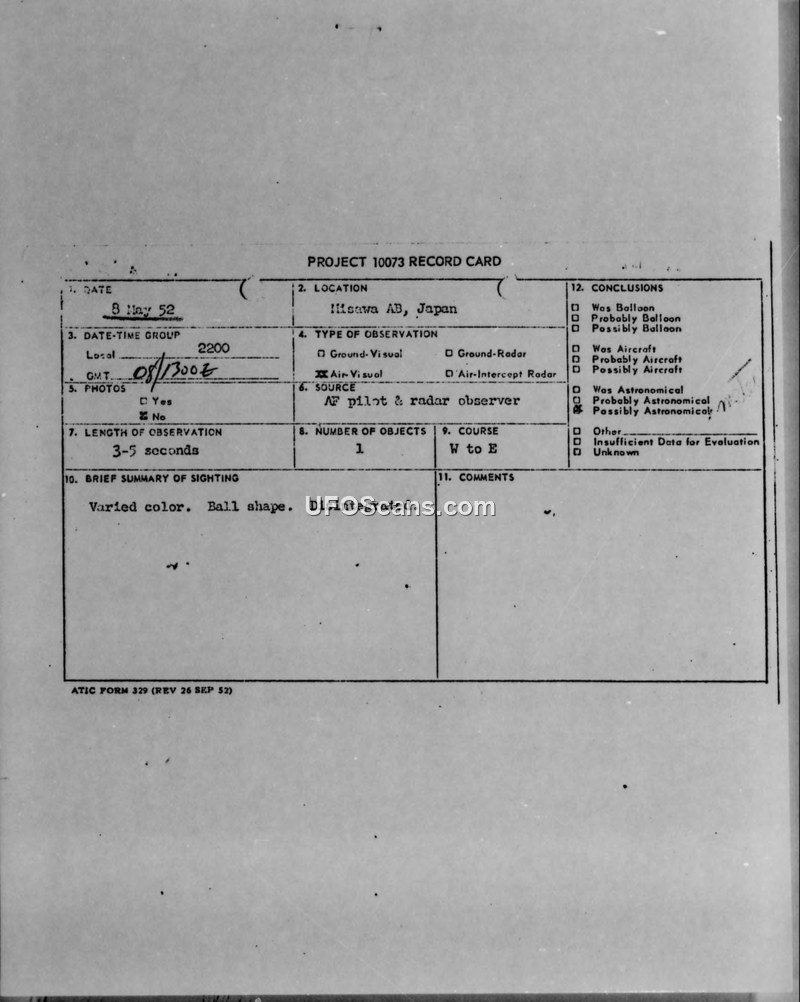 USAF aircrew reported a multi-colored, ball-shaped object that disintegrated in the air near Misawa Air Base on 8 May 1952. FEAF intelligence officially concluded the sighting was likely a lighted weather balloon.