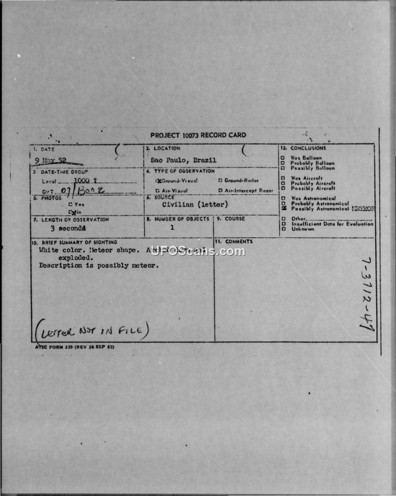 The sighting in Sao Paulo was identified as a possible meteor. Separate investigations at George AFB concluded that many sightings there were attributable to Rawinsonde balloons released from Edwards AFB.