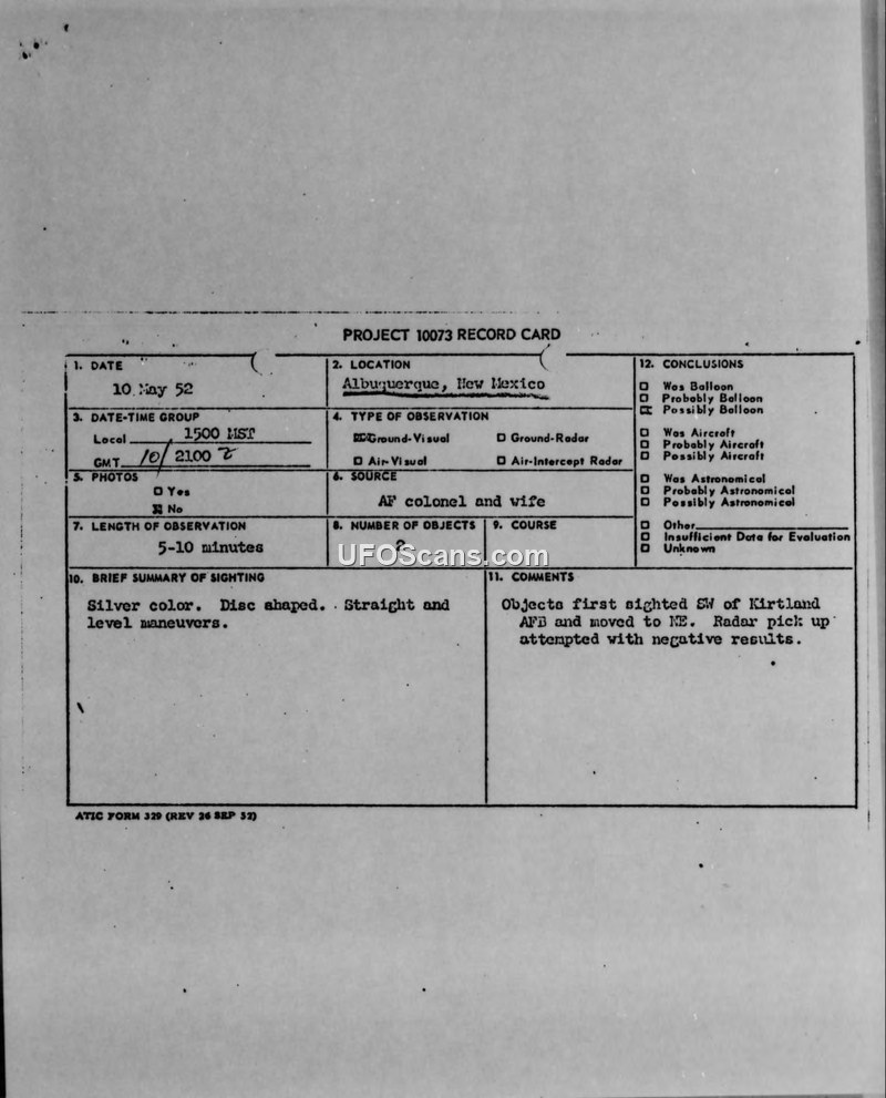 Project 10073 Record Card — Albuquerque, New Mexico, 10 May 1952