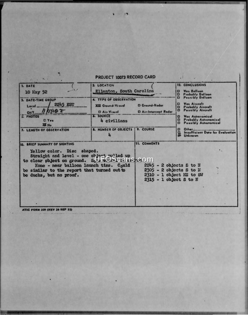 Project 10073 Record Card — Ellenton, South Carolina, 10 May 1952