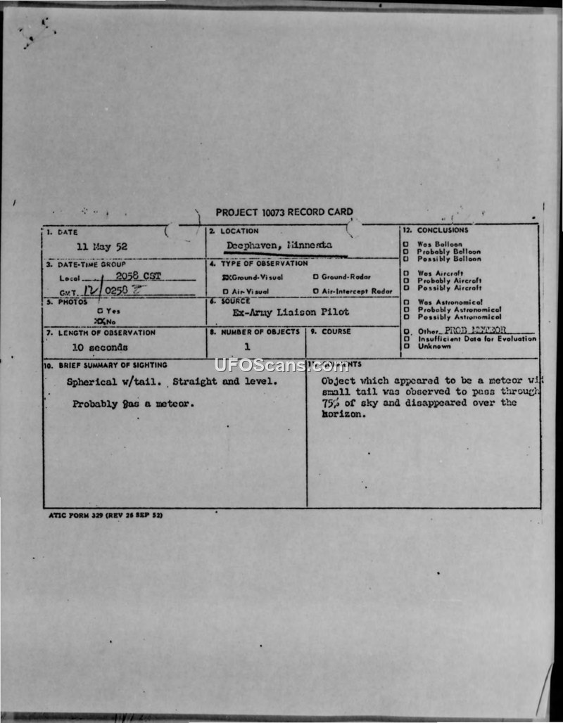 Project 10073 Record Card — Deephaven, Minnesota, 11 May 1952