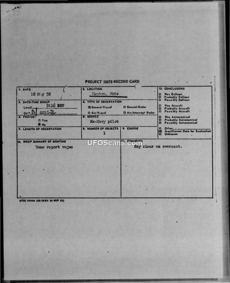 A commercial pilot and Navy veteran reported an unidentified object over Kenton, Ohio, on May 12, 1952. The object was described as traveling at 500-600 MPH at 20,000 feet without a vapor trail.
