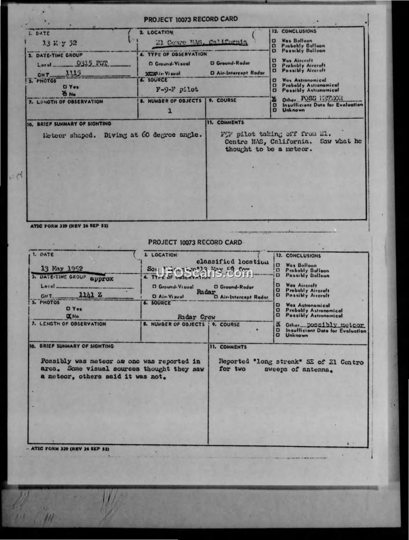 Two Project 10073 record cards document UAP sightings near El Centro, California, on May 13, 1952, involving both pilot and radar observations. Both incidents were officially categorized as possibly being meteors.