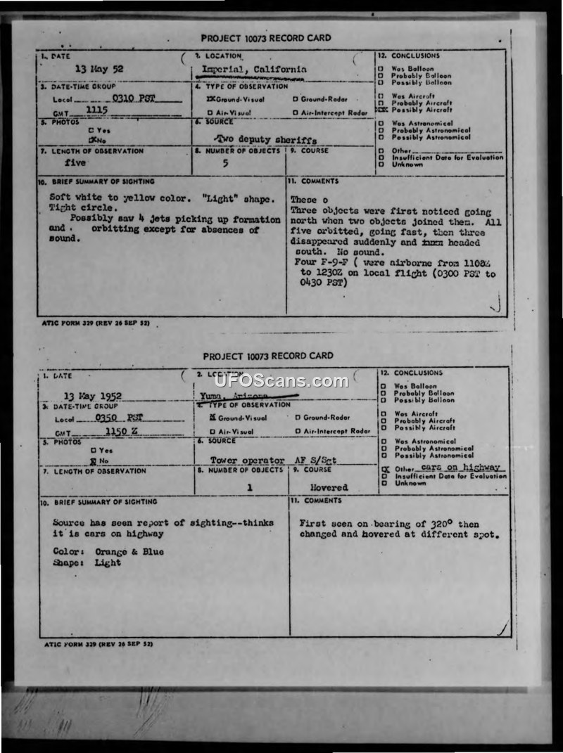 This document contains two Project 10073 record cards detailing UAP sightings from May 13, 1952. The first report, originating from Imperial, California, involves five objects described as soft white to yellow in color with a 'light' shape. The witnesses, identified as two deputy sheriffs, observed the objects moving north before two joined the group. All five then orbited at high speed; three subsequently disappeared, and the remaining two headed south. The report notes that four F-9-F aircraft were airborne in the area during this time, but no sound was reported from the objects. The second report, from Yuma, Arizona, involves a single object described as orange and blue. The witness, a tower operator (AF S/Sgt), initially observed the object on a bearing of 320 degrees before it changed position and hovered. The report notes that the source of the sighting believed the object to be cars on a highway.