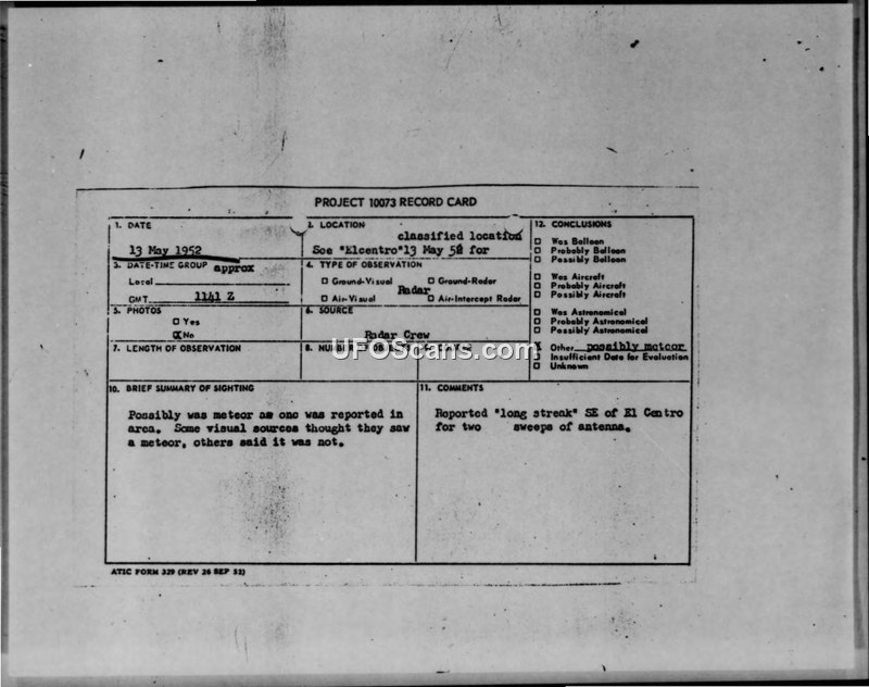 Reporting of Information on Unconventional Aircraft — El Centro, California, 13 May 1952